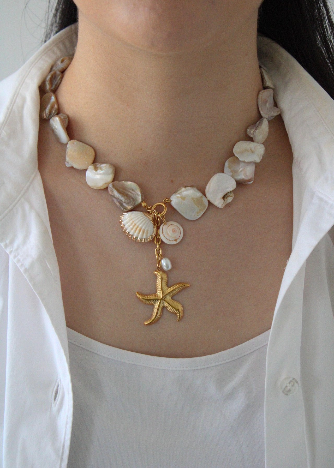 Conchas naturales y acero inoxidable con chapa de oro 18k.